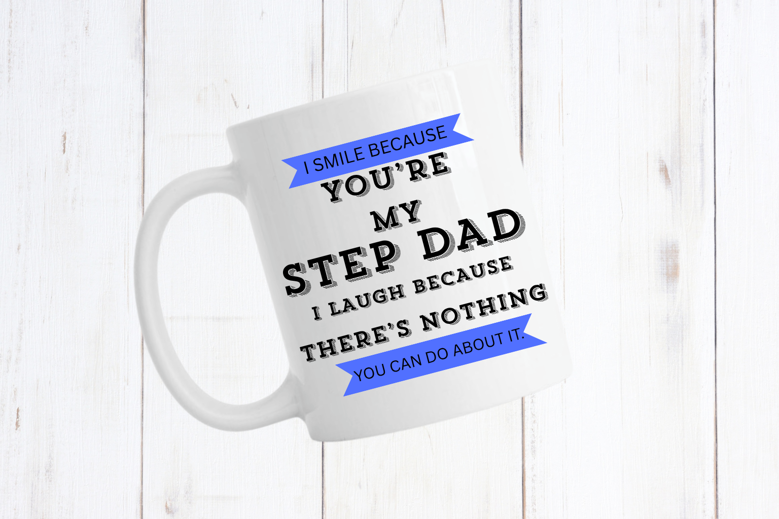 Show your Step Dad just how much he means to you with this fun and cheeky mug! Featuring the humorous quote “I smile because you’re my Step Dad, I laugh because there’s nothing you can do about it.” — it’s the perfect mix of love and laughter.